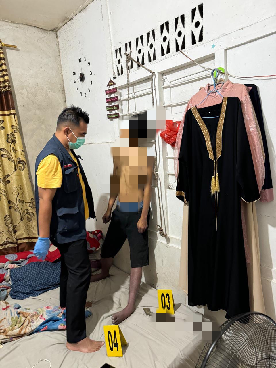 Lalu, mertua korban mengintip dari kamar sebelah dan melihat korban dalam posisi leher terjerat tali.