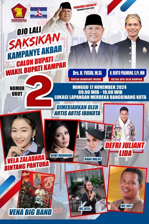 Wawasannusantara.com, Bangkinang — Sejumlah artis Ibukota bakal meramaikan Kampanye Akbar Pasangan Calon Bupati/Wakil Bupati Kampar Nomor Urut 2 Drs H Yusri, MSi-H Rinto Pramono, SPi, MM yang akan digelar di Lapangan Merdeka, Bangkinang, Minggu (17/11/2024) mulai pukul 09.00 WIB-18.00 WIB.