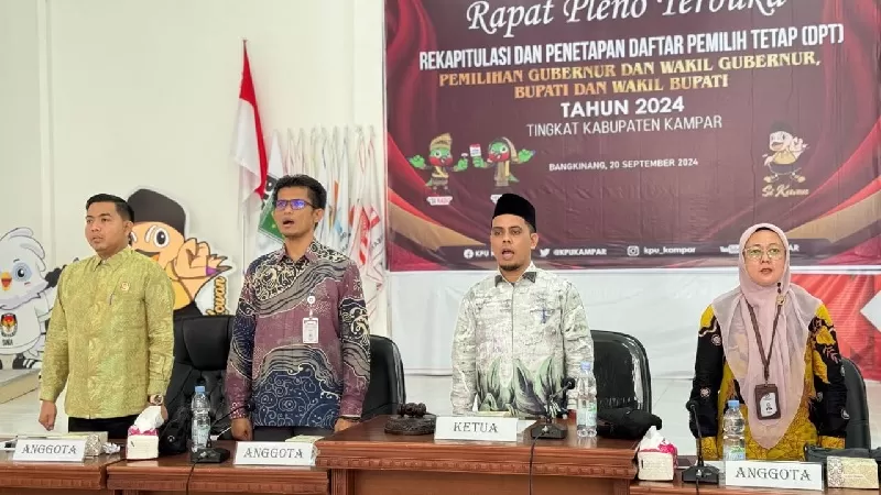 Wawasannusantara,com, Bangkinang — KPU Kabupaten Kampar melaksanakan rapat pleno Rekapitulasi Daftar Pemilih Tetap (DPT) untuk Pilkada 2024 sebanyak 601.561 orang pemilih di Aula Kantor KPU Kabupaten Kampar, Bangkinang Jumat (20/11/2024).
